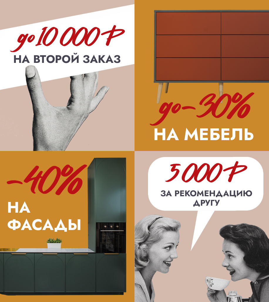 -40% на фасады До -30% на мебель До 10 000₽ На каждый второй заказ 5000₽ за рекомендацию другу* *подробнее у дизайнеров в салонах