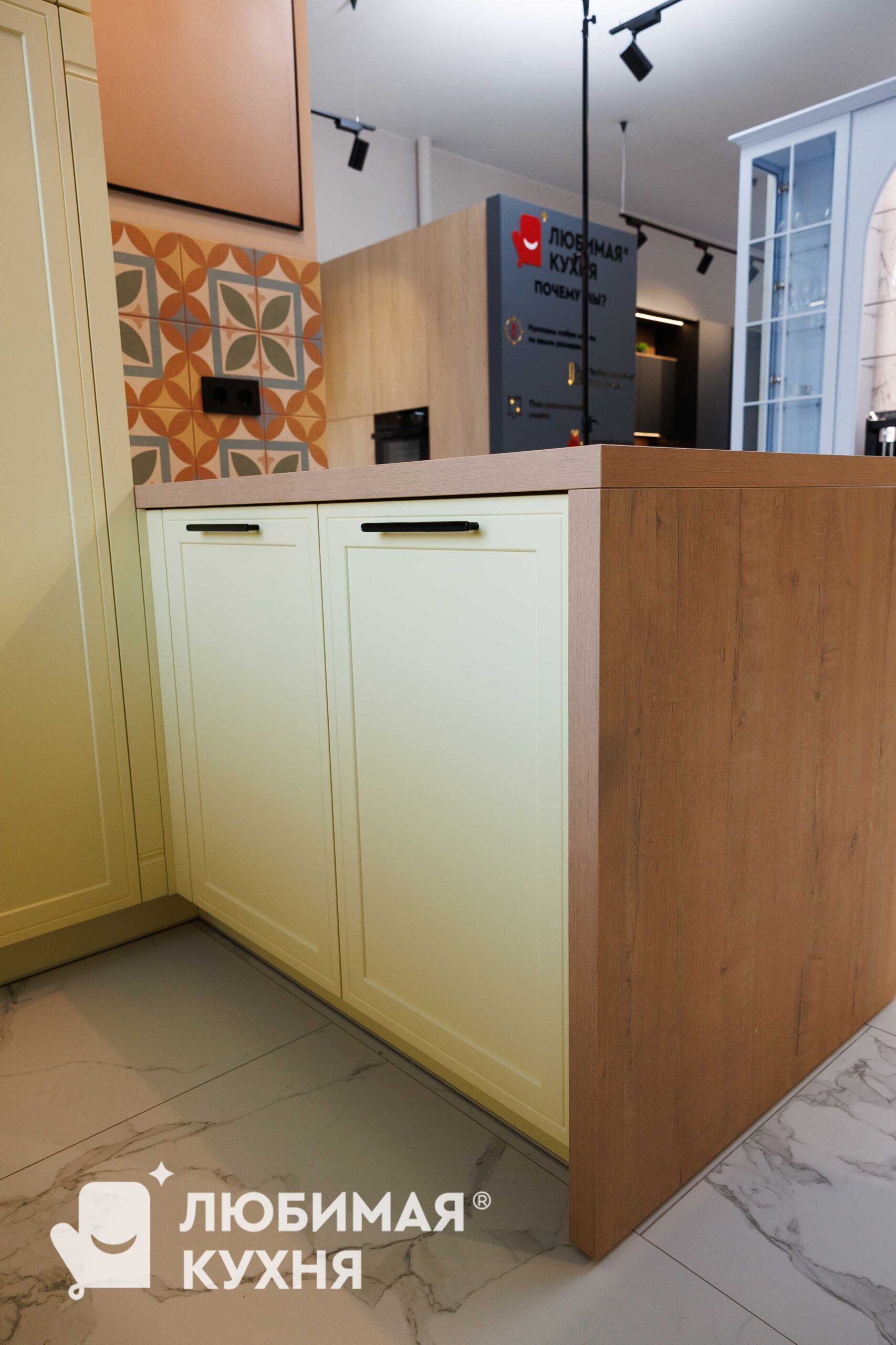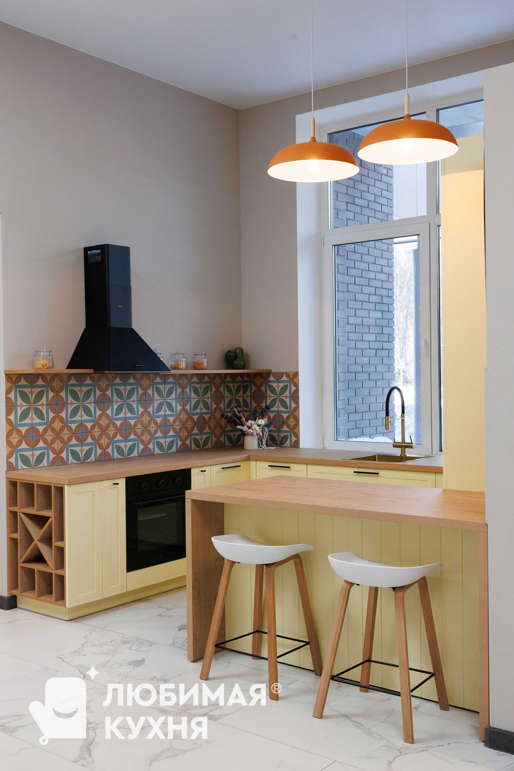 Уютная кухня в скандинавском стиле с фасадами нежно-лимонного оттенка. Фартук из цементной плитки с геометрическим орнаментом в терракотовых и оливковых тонах добавляет характер пространству. Функциональный остров из ЛДСП с текстурой дуба со встроенной розеткой служит обеденной зоной. Очень милая кухня, которая прекрасно впишется в интерьер квартиры и загородного дома.