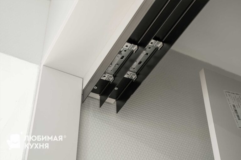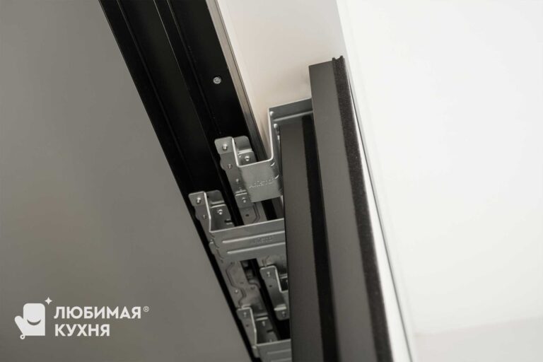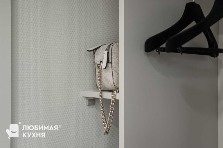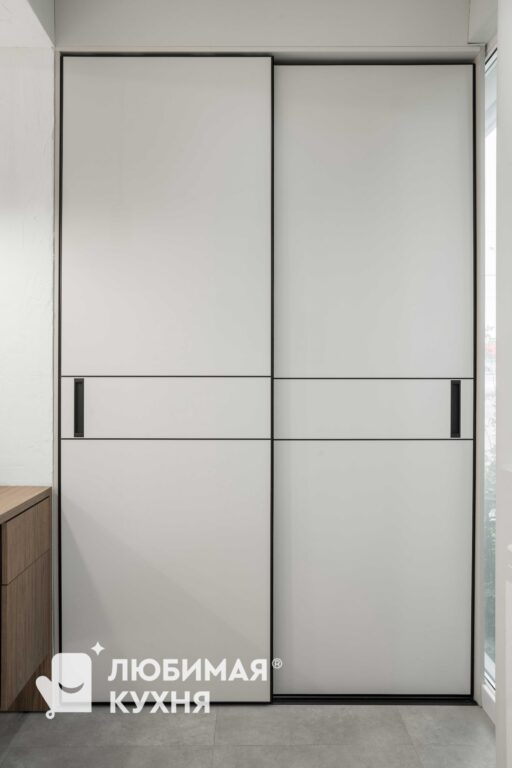 Искусство утонченного минимализма. Серо-коричневые матовые фасады шкафов создают монолитное пространство, сливаясь со стенами. Удобные и стильные ручки, которые вырезаны в фасадах и создают дополнительный ритм. Фишкой данного шкафа является его подвесная конструкция, которая образует пространство под шкафом с подсветкой для размещения обуви.